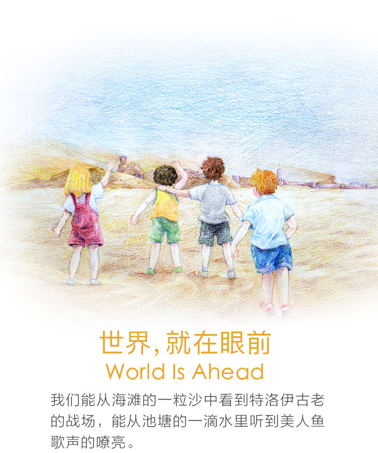 世界就在眼前 他们不能从海滩的一粒沙中看到特洛伊古老的战场,更不能从池塘的一滴水里听到美人鱼歌声的嘹亮。 而我们是天地间最自由的精灵,我们需要美丽的故事,浪漫的幻想。